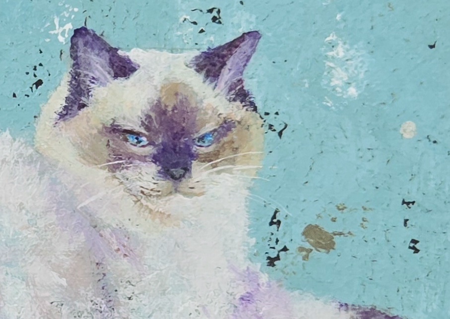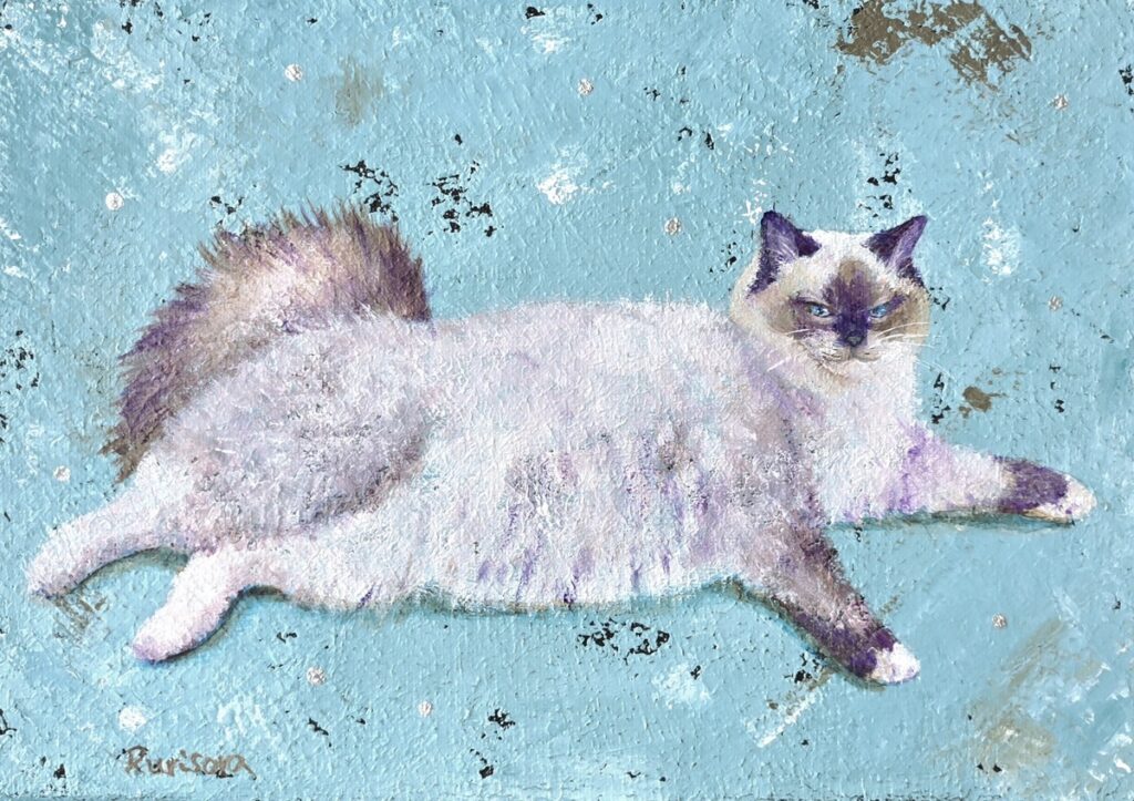 現在出品している作品の中で私が一番好きな絵です。この背景と猫の色の組み合わせが気に入っています。全体のポーズがどてっとして可愛くて、モフモフでそんなところが魅力的で描いてみました。