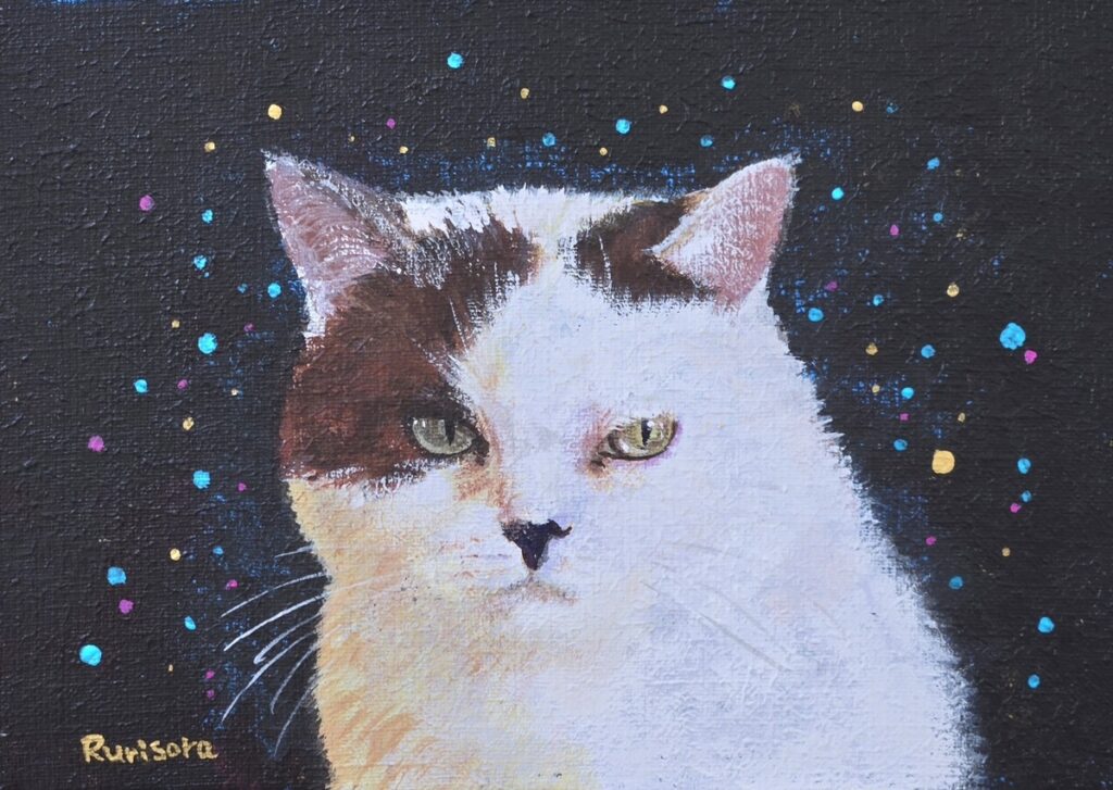 同じようにベースはダークカラーで、濃い青色だったのですが、その上に、キャンバスの外側からぐるっと金色の葉っぱが猫を囲むように描いていました。それはそれで気に入っていたのですが、ずっと見ていたらその金色が少しうるさいかなと思って消しちゃいました。シンプルな背景にして、主人公の無愛想猫がより引き立って良くなったと思います。